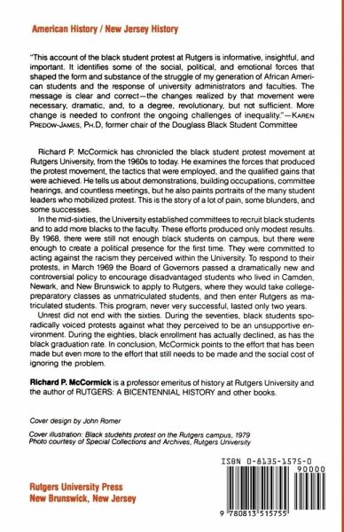 Richard P. McCormick has chronicled the black student protest movement at Rutgers University, from the 1960s to today. He examines the forces that produced the protest movement, the tactics that were employed, and the qualified gains that were achieved. He tells us about demonstrations, building occupations, committee hearings and countless meetings, but he also paints portraits of the many student leaders who mobilized protest. This is the story of a lot of pain, some blunders, and some successes.
