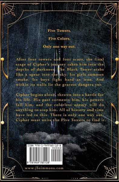 Five towers. Five colors. One way out. After four towers and four scars, the final stage of Cipher's journey takes him into the depths of darkness. The Black Tower stabs like a spear into the sky. Its girls summon smoke. Its boys fight hard as iron. And within its walls lie the gravest dangers yet. Cipher begins alone, thrown into a battle for his life. His past torments him, his powers fail him, and the colorless enemy will do anything to stop him. All of history and time have led to this. There is only one way out. Cipher must unite the Five Towers to find it.