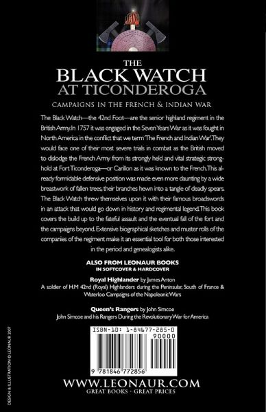 The Black Watch-the 42nd Foot-are the senior highland regiment in the British Army. In 1757 it was engaged in the Seven Years War as it was fought in North America in the conflict that we term 'The French and Indian War'. They would face one of their most severe trials in combat as the British moved to dislodge the French Army from its strongly held and vital strategic stronghold at Fort Ticonderoga-or Carillon as it was known to the French. This already formidable defensive position was made even more daunting by a wide breastwork of fallen trees, their branches hewn into a tangle of deadly spears. The Black Watch threw themselves upon it with their famous broadswords in an attack that would go down in history and regimental legend. This book covers the build up to the fateful assault and the eventual fall of the fort and the campaigns beyond. Extensive biographical sketches and muster rolls of the companies of the regiment make it an essential tool for both those interested in the period and genealogists alike.