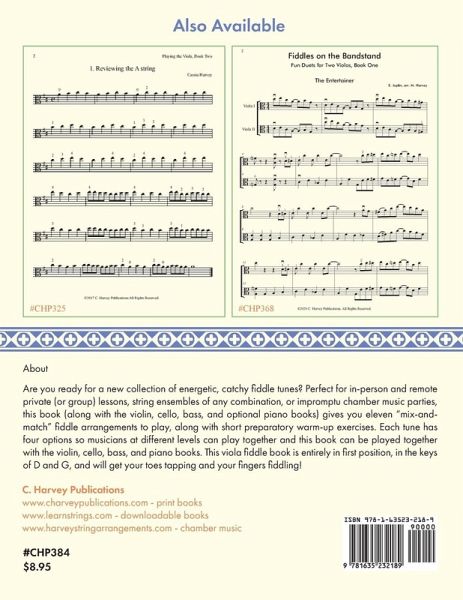 Are you ready for a new collection of energetic, catchy fiddle tunes? The Blackberry Blossom Fiddle Book for Viola is here! This book has tunes and harmonies you will hum through the rest of the day and can give you a new reason to get excited about playing the viola! Perfect for in-person and remote private (or group) lessons, string ensembles of any combination, or impromptu chamber music parties, this book (along with the violin, cello, bass, and optional piano books) gives you eleven "mix-and-match" fiddle arrangements to play, along with short preparatory warm-up exercises.Each tune has four options so musicians at different levels can play together: an Advanced Melody, a Stress-Free Melody, a Basic Harmony, and a Teacher Harmony. You can warm up with the exercises, try the Stress-Free Melody, and then work towards the Advanced Melody. The Blackberry Blossom Fiddle Book for Viola can be played in a group or group class with the violin, cello, bass, and piano books; all of the tunes can be learned and played together as duets, trios, or in groups of any size. This viola fiddle book is entirely in first position, in the keys of D and G and will get your toes tapping and your fingers fiddling!