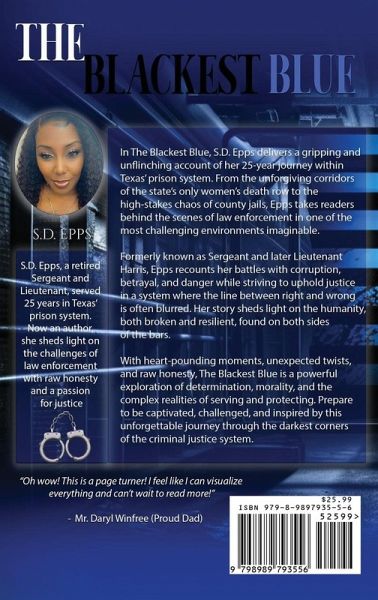 S.D. Epps is a seasoned former law enforcement officer, boasting 25 years of experience across jails and prisons from New York to Texas. Her writing invites readers on an unparalleled journey, offering insights that money can't buy. After serving on active duty in the U.S. Army, Epps immediately began her career in juvenile detention in Queens, NY. After relocating to Texas, she became an officer in the only Women's Death Row unit, followed by two county jails where she rose to the ranks from Sergeant to Lieutenant in Williamson County. Through her honest and oftentimes witty storytelling, Epps provides an insider's view of the challenges, dangers, and moral complexities inherent in life behind bars. Hailing from Brownsville in the city of Brooklyn, Epps is an authentic advocate for justice and reform. Using her voice to illuminate the often-misunderstood realities of the criminal justice system. Beyond writing, she is an accomplished entrepreneur, dedicated to mentoring young professionals across various aspects of life, and cherishes spending quality time with her family. Epps' debut autobiographical novel, The Blackest Blue, offers readers an unfiltered look into the raw and unpredictable world of law enforcement, particularly from the perspective of being both black and blue.