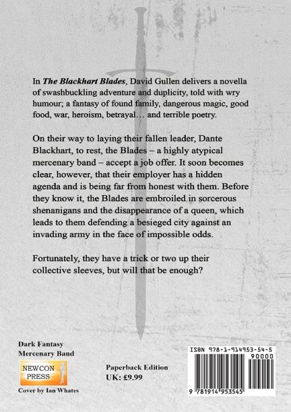 On their way to laying their fallen leader, Dante Blackhart, to rest, the Blades - a highly atypical mercenary band - accept a job offer. It soon becomes clear, however, that their employer has a hidden agenda and is being far from honest with them. Before they know it, the Blades are embroiled in sorcerous shenanigans and the disappearance of a queen, which leads to them defending a besieged city against an invading army in the face of impossible odds. Fortunately, they have a trick or two up their collective sleeves, but at what cost, and will even that be enough? In The Blackhart Blades, David Gullen delivers a novella of swashbuckling adventure and duplicity, told with wry humour; a fantasy of found family, dangerous magic, good food, war, heroism, betrayal... and terrible poetry.