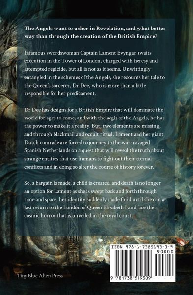 The Angels want to usher in Revelation, and what better way than through the creation of the British Empire? Infamous swordswoman Captain Lament Evyngar awaits execution in the Tower of London, charged with heresy and attempted regicide, but all is not as it seems. Unwittingly entangled in the schemes of the Angels, she recounts her tale to the Queen's sorcerer, Dr Dee, who is more than a little responsible for her predicament. Dr Dee has designs for a British Empire that will dominate the world for ages to come, and with the aegis of the Angels, he has the power to make it a reality. But, two elements are missing, and through blackmail and occult ritual, Lament and her giant Dutch comrade are forced to journey to the war-ravaged Spanish Netherlands on a quest that will reveal the truth about strange entities that use humans to fight out their eternal conflicts and in doing so alter the course of history forever. So, a bargain is made, a child is created, and death is no longer an option for Lament as she is swept back and forth through time and space, her identity suddenly made fluid until she can at last return to the London of Queen Elizabeth I and face the cosmic horror that is unveiled in the royal court.