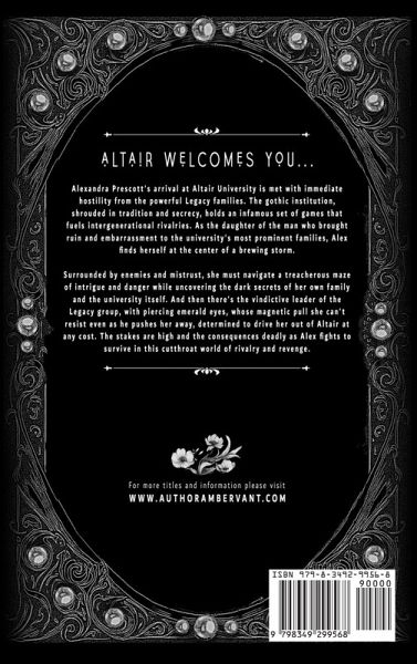 Alexandra Prescott's arrival at Altair University is met with immediate hostility from the powerful Legacy families. The gothic institution, shrouded in tradition and secrecy, holds an infamous set of games that fuels intergenerational rivalries. As the daughter of the man who brought ruin and embarrassment to the university's most prominent families, Alex finds herself at the center of a brewing storm. Surrounded by enemies and mistrust, she must navigate a treacherous maze of intrigue and danger while uncovering the dark secrets of her own family and the university itself. And then there's the vindictive leader of the Legacy group, with piercing emerald eyes, whose magnetic pull she can't resist even as he pushes her away, determined to drive her out of Altair at any cost. The stakes are high and the consequences deadly as Alex fights to survive in this cutthroat world of rivalry and revenge. "Imagine A Series of Unfortunate Events mixed with Zodiac Academy, a touch of Deadly Class, and a dash of Wednesday-you get Altair University. The gothic vibes are immaculate. So many twists and secrets to uncover." -Reader Review "Secrets, betrayal, sabotage, and revenge-I am completely obsessed. I devoured this book in a day, and that cliffhanger? Unbelievable." -Reader Review "Amber Vant has absolutely nailed this book! The ability to make you hate a character within the first 15 pages is a skill not many possess!" -Reader Review "This book is unputdownable. I finished it in less than a day, and that cliffhanger? I need the next book NOW." -Reader Review
