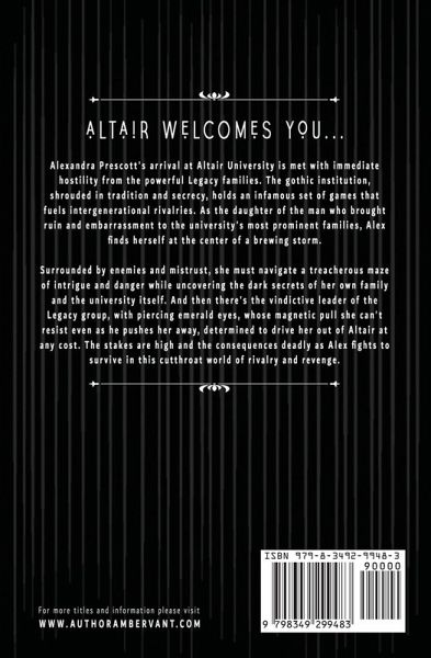 Alexandra Prescott's arrival at Altair University is met with immediate hostility from the powerful Legacy families. The gothic institution, shrouded in tradition and secrecy, holds an infamous set of games that fuels intergenerational rivalries. As the daughter of the man who brought ruin and embarrassment to the university's most prominent families, Alex finds herself at the center of a brewing storm. Surrounded by enemies and mistrust, she must navigate a treacherous maze of intrigue and danger while uncovering the dark secrets of her own family and the university itself. And then there's the vindictive leader of the Legacy group, with piercing emerald eyes, whose magnetic pull she can't resist even as he pushes her away, determined to drive her out of Altair at any cost. The stakes are high and the consequences deadly as Alex fights to survive in this cutthroat world of rivalry and revenge. "Imagine A Series of Unfortunate Events mixed with Zodiac Academy, a touch of Deadly Class, and a dash of Wednesday-you get Altair University. The gothic vibes are immaculate. So many twists and secrets to uncover." -Reader Review "Secrets, betrayal, sabotage, and revenge-I am completely obsessed. I devoured this book in a day, and that cliffhanger? Unbelievable." -Reader Review "Amber Vant has absolutely nailed this book! The ability to make you hate a character within the first 15 pages is a skill not many possess!" -Reader Review "This book is unputdownable. I finished it in less than a day, and that cliffhanger? I need the next book NOW." -Reader Review