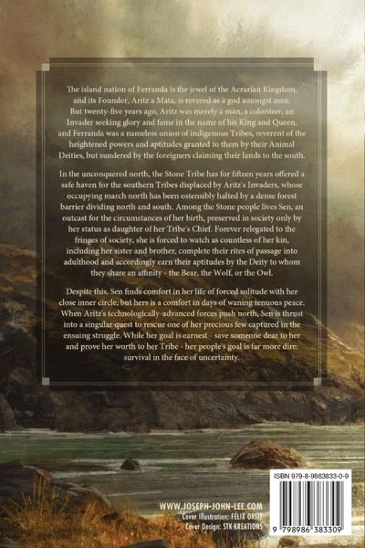 The island nation of Ferranda is the jewel of the Acrarian Kingdom, and its Founder, Aritz a Mata, is revered as a god amongst men. But twenty-five years ago, Aritz was merely a man, a colonizer, an Invader seeking glory and fame in the name of his King and Queen, and Ferranda was a nameless union of indigenous Tribes, reverent of the heightened powers and aptitudes granted to them by their Animal Deities, but sundered by the foreigners claiming their lands to the south. In the unconquered north, the Stone Tribe has for fifteen years offered a safe haven for the southern Tribes displaced by Aritz's Invaders, whose occupying march north has been ostensibly halted by a dense forest barrier dividing north and south. Among the Stone people lives Sen, an outcast for the circumstances of her birth, preserved in society only by her status as daughter of her Tribe's Chief. Forever relegated to the fringes of society, she is forced to watch as countless of her kin, including her sister and brother, complete their rites of passage into adulthood and accordingly earn their aptitudes by the Deity to whom they share an affinity - the Bear, the Wolf, or the Owl. Despite this, Sen finds comfort in her life of forced solitude with her close inner circle, but hers is a comfort in days of waning tenuous peace. When Aritz's technologically-advanced forces push north, Sen is thrust into a singular quest to rescue one of her precious few captured in the ensuing struggle. While her goal is earnest - save someone dear to her and prove her worth to her Tribe - her people's goal is far more dire: survival in the face of uncertainty.