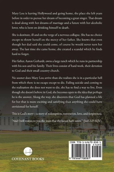 Mary Lou is leaving Hollywood and going home, the place she left years before in order to pursue her dream of becoming a great singer. That dream is dead along with her dreams of marriage and a future with her alcoholic lover, who is bent on drinking himself to death. She is destitute, ill and on the verge of a nervous collapse. She has no choice except to throw herself on the mercy of her father. She knows that even though her dad said she could come, of course he would never turn her away. The last time she came home, she created a scandal which he finds hard to forget. Her father, Aaron Gerhardt, owns a large ranch which he runs in partnership with his son and his family. Their lives consist of hard work, their devotion to God and their small country church. No sooner does Mary Lou arrive than she realizes she is in a particular hell from which there is no escape except to die. Failing suicide and coming to the realization she does not want to die, she has to find a way to live. Even though she doesn't believe in God, she becomes open to the idea that perhaps he is the answer. Along the way, she discovers that God has planned a life for her that is more exciting and satisfying than anything she could have envisioned for herself. This is God's story-a story of redemption, restoration, love, and forgiveness. "And I will restore to you the years that the locust hath eaten," (Joel 2:25 KJV).