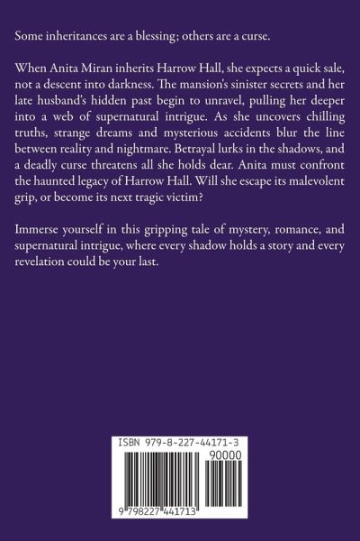 Some inheritances are a blessing; others are a curse. When Anita Miran inherits Harrow Hall, she expects a quick sale, not a descent into darkness. The mansion's sinister secrets and her late husband's hidden past begin to unravel, pulling her deeper into a web of supernatural intrigue. As she uncovers chilling truths, strange dreams and mysterious accidents blur the line between reality and nightmare. Betrayal lurks in the shadows, and a deadly curse threatens all she holds dear. Anita must confront the haunted legacy of Harrow Hall. Will she escape its malevolent grip, or become its next tragic victim? Immerse yourself in this gripping tale of mystery, romance, and supernatural intrigue, where every shadow holds a story and every revelation could be your last.