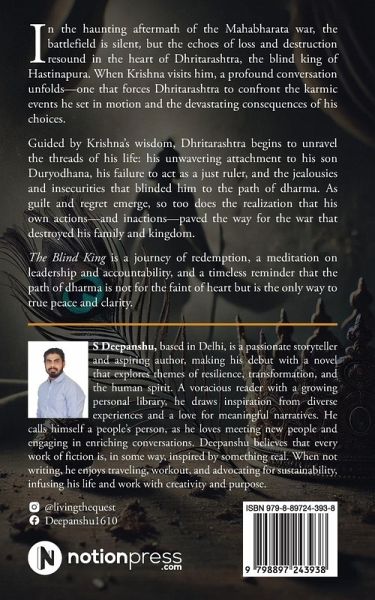 In the haunting aftermath of the Mahabharata war, the battlefield is silent, but the echoes of loss and destruction resound in the heart of Dhritarashtra, the blind king of Hastinapura. When Krishna visits him, a profound conversation unfolds-one that forces Dhritarashtra to confront the karmic events he set in motion and the devastating consequences of his choices. Guided by Krishna's wisdom, Dhritarashtra begins to unravel the threads of his life: his unwavering attachment to his son Duryodhana, his failure to act as a just ruler, and the jealousies and insecurities that blinded him to the path of dharma. As guilt and regret emerge, so too does the realization that his own actions-and inactions-paved the way for the war that destroyed his family and kingdom. The Blind King is a journey of redemption, a meditation on leadership and accountability, and a timeless reminder that the path of dharma is not for the faint of heart but is the only way to true peace and clarity.