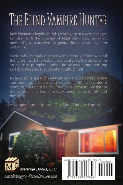 Jack Poisner is legally blind; growing up in a world not yet familiar with the concept of legal blindness, he learns how to fight to survive his peers, the education system and more. Eventually, happily married with a family of his own and living well with his visual disadvantages, life throws him an overripe pumpkin - when he wakes up one morning and discovers, he is suddenly, totally blind. Although adjusting to his new life of visual darkness a new and much greater darkness enters his life, a boarder: A vampire, that only he can see, has come to live within the safety of his home, in easy reach of his family and himself. A vampire hunter is born-The Blind Vampire Hunter