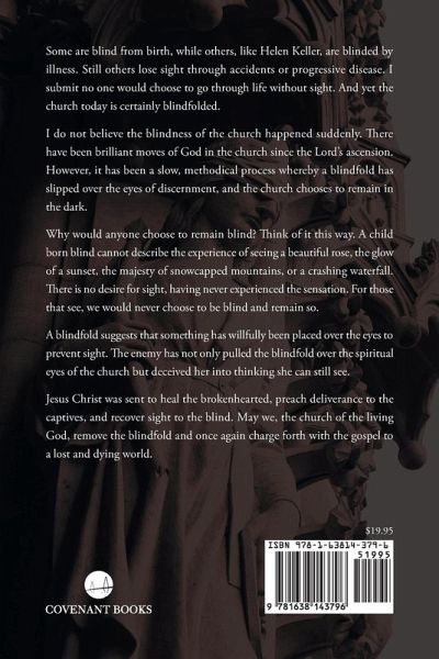 Some are blind from birth, while others, like Helen Keller, are blinded by illness. Still others lose sight through accidents or progressive disease. I submit no one would choose to go through life without sight. And yet the church today is certainly blindfolded. I do not believe the blindness of the church happened suddenly. There have been brilliant moves of God in the church since the Lord's ascension. However, it has been a slow, methodical process whereby a blindfold has slipped over the eyes of discernment, and the church chooses to remain in the dark. Why would anyone choose to remain blind? Think of it this way. A child born blind cannot describe the experience of seeing a beautiful rose, the glow of a sunset, the majesty of snowcapped mountains, or a crashing waterfall. There is no desire for sight, having never experienced the sensation. For those that see, we would never choose to be blind and remain so. A blindfold suggests that something has willfully been placed over the eyes to prevent sight. The enemy has not only pulled the blindfold over the spiritual eyes of the church but deceived her into thinking she can still see. Jesus Christ was sent to heal the brokenhearted, preach deliverance to the captives, and recover sight to the blind. May we, the church of the living God, remove the blindfold and once again charge forth with the gospel to a lost and dying world.