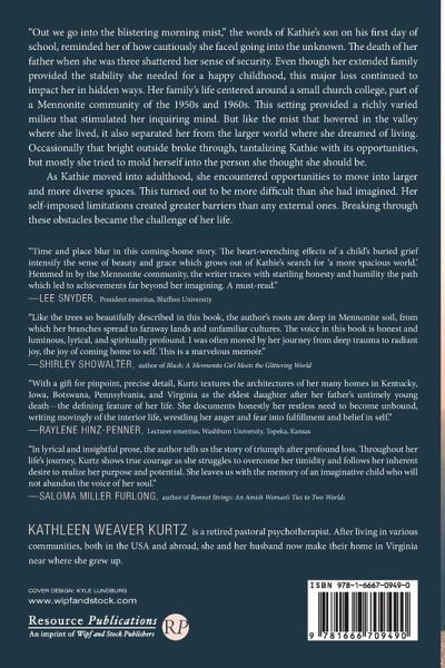""Out we go into the blistering morning mist,"" the words of Kathie's son on his first day of school, reminded her of how cautiously she faced going into the unknown. The death of her father when she was three shattered her sense of security. Even though her extended family provided the stability she needed for a happy childhood, this major loss continued to impact her in hidden ways. Her family's life centered around a small church college, part of a Mennonite community of the 1950s and 1960s. This setting provided a richly varied milieu that stimulated her inquiring mind. But like the mist that hovered in the valley where she lived, it also separated her from the larger world where she dreamed of living. Occasionally that bright outside broke through, tantalizing Kathie with its opportunities, but mostly she tried to mold herself into the person she thought she should be. As Kathie moved into adulthood, she encountered opportunities to move into larger and more diverse spaces. This turned out to be more difficult than she had imagined. Her self-imposed limitations created greater barriers than any external ones. Breaking through these obstacles became the challenge of her life.