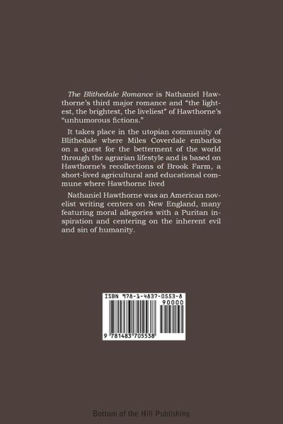 The Blithedale Romance is Nathaniel Hawthorne's third major romance and "the lightest, the brightest, the liveliest" of Hawthorne's "unhumorous fictions." It takes place in the utopian community of Blithedale where Miles Coverdale embarks on a quest for the betterment of the world through the agrarian lifestyle and is based on Hawthorne's recollections of Brook Farm, a short-lived agricultural and educational commune where Hawthorne lived Nathaniel Hawthorne was an American novelist writing centers on New England, many featuring moral allegories with a Puritan inspiration and centering on the inherent evil and sin of humanity.
