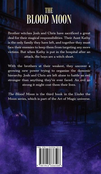 Brother witches Josh and Chris have sacrificed a great deal for their magical responsibilities. Their Aunt Kathy is the only family they have left, and together they must face their enemies to keep them from targeting any more victims. But when Kathy is put in the hospital after an attack, the boys are a witch short. With the brothers at their weakest, they uncover a growing new power trying to organize the demonic hierarchy. Josh and Chris are left alone to battle an evil stronger than anything they've ever faced. An evil so strong it might cost them their lives. The Blood Moon is the third book in the Under the Moon series, which is a part of the Art of Magic universe, containing the Lost By Magic and the Coven series.