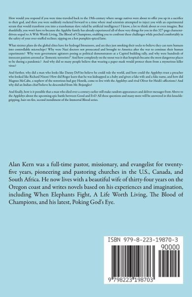 How would you respond if you were time-traveled back to the 19th-century where savage natives were about to offer you up in a sacrifice to their god, and then you were suddenly rocketed forward to a time where mad scientists attempted to inject you with an experimental serum that would transform you into a transhuman slave ruled by artificial intelligence? I know, a lot to think about or even imagine. But thankfully, you won't have to because the Appleby family has already experienced all of these very things for you in this 327-page character-driven sequel to A Wife Worth Living, The Blood of Champions, enabling you to confront these challenges while perched comfortably in the safety of your over-stuffed recliner, sipping on a hot pumpkin-spiced latte. What sinister plans do the global elites have for hydrogel biosensors, and are they just smoking their socks to believe they can turn humans into controllable microchips? Why were Nazi doctors not prosecuted and brought to America after the war to continue their human experiments? Why were government agitators posing as political demonstrators at a Capitol building rally, and why were hundreds of innocent patriots arrested as "domestic terrorists?" And how completely on the snout was it that hospitals became the most dangerous places to be during a pandemic? And why did so many people believe that wearing a paper mask would protect them from a mysterious killer virus? And further, why did a man who looks like Danny DeVito believe he could rule the world, and how could the Applebys trust a preacher who looked like Richard Nixon? How did Roger learn that he was kidnapped as a baby and given a fake wife and a fake name, and how did Magnus McCabe, a nephew of the notorious bad guy Henrik, come to live with the Applebys and rival Oliver for Heidi's affections? And why did an Indian chief believe he descended from Mr. Bojangles? And finally, how is it possible that a man who died over a century earlier still make random appearances and deliver messages from Above to the Applebys about the upcoming epic battle between Good and Evil? All these questions and many more will be answered in this knuckle-gripping, hair-on-fire, second installment of the Immortal Blood series.