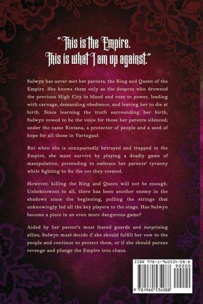 "This is the Empire. This is what I am up against." Sulwyn has never met her parents, the King and Queen of the Empire. She knows them only as the despots who drowned the previous High City in blood and rose to power, leading with carnage, demanding obedience, and leaving her to die at birth. Since learning the truth surrounding her birth, Sulwyn vowed to be the voice for those her parents silenced; under the name Kintana, a protector of people and a star of hope for all those in Vartugaul. But when she is unexpectedly betrayed and trapped in the Empire, she must survive by playing a deadly game of manipulation, pretending to embrace her parents' tyranny while fighting to fix the rot they created. However, killing the King and Queen will not be enough. Unbeknownst to all, there has been another enemy in the shadows since the beginning, pulling the strings that unknowingly led all the key players to the stage. Has Sulwyn become a piece in an even more dangerous game? Aided by her parent's most feared guards and surprising allies, Sulwyn must decide if she should fulfill her vow to the people and continue to protect them, or if she should pursue revenge and plunge the Empire into chaos.