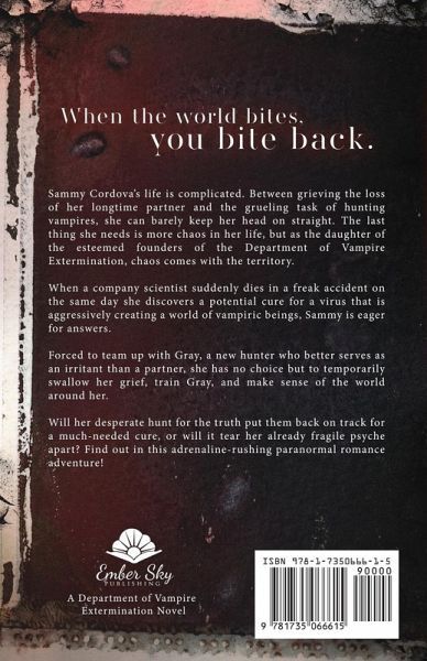When the world bites, you bite back. Sammy Cordova's life is complicated. Between grieving the loss of her longtime partner and the grueling task of hunting vampires, she can barely keep her head on straight. The last thing she needs is more chaos in her life, but as the daughter of the esteemed founders of the Department of Vampire Extermination, chaos comes with the territory. When a company scientist suddenly dies in a freak accident on the same day she discovers a potential cure for a virus that is aggressively creating a world of vampiric beings, Sammy is eager for answers. Forced to team up with Gray, a new hunter who better serves as an irritant than a partner, she has no choice but to temporarily swallow her grief, train Gray, and make sense of the world around her. Will her desperate hunt for the truth put them back on track for a much-needed cure, or will it tear her already fragile psyche apart? Find out in this adrenaline-rushing paranormal romance adventure!