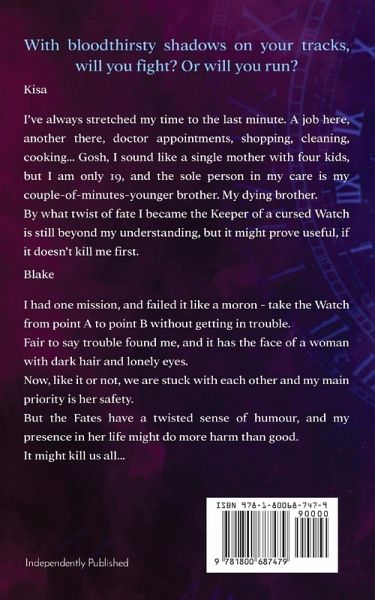 With bloodthirsty shadows on your tracks, will you fight? Or will you run?Kisa I've always stretched my time to the last minute. A job here, another there, doctor appointments, shopping, cleaning, cooking... Gosh, I sound like a single mother with four kids, but I am only 19, and the sole person in my care is my couple-of-minutes-younger brother. My dying brother. By what twist of fate I became the Keeper of a cursed Watch is still beyond my understanding, but it might prove useful, if it doesn't kill me first . Blake I had one mission, and failed it like a moron - take the Watch from point A to point B without getting in trouble. Fair to say trouble found me, and it has the face of a woman with dark hair and lonely eyes. Now, like it or not, we are stuck with each other and my main priority is her safety. But the Fates have a twisted sense of humour, and my presence in her life might do more harm than good. It might kill us all...
