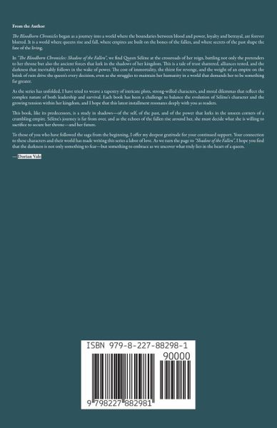 The Bloodborn Chronicles: Shadow of the Fallen In the fifth installment of The Bloodborn Chronicles, Shadow of the Fallen propels readers into a world on the brink of destruction. As Sélène, the indomitable Queen, rises from the ashes of betrayal, dark forces and ancient enemies lurk in the shadows, threatening the very foundation of her reign. The once-mighty Empire is fractured, torn apart by whispers of forgotten power and the rise of a mysterious pretender to the throne. With her kingdom in turmoil, Sélène must navigate the treacherous waters of politics, blood oaths, and deadly secrets. Allies become enemies, and even the most trusted of friends may wield daggers behind smiling faces. As Sélène confronts the shadows of her past, a forgotten kingdom's secrets resurface, and the ancient blood pact that bound her people threatens to tear her apart. The cost of immortality becomes painfully clear, and the Queen must make choices that could change the fate of her realm forever. The battle intensifies as an uprising in the lower city sets the streets ablaze, forcing Sélène to take the field herself. With the Shadow Council working in the background to manipulate her every move, she is forced to gamble everything on her survival. When an old enemy resurfaces and the gates of the dead open, Sélène is thrust into a trial of loyalty, magic, and bloodshed that will leave her questioning everything she once believed. With the kingdom in flames and an army of the damned on the horizon, the stage is set for a final confrontation that will determine the fate of the throne. Shadow of the Fallen is a tale of power, betrayal, and the lengths one woman will go to protect what is hers. As the battle for the throne reaches its bloody climax, the echoes of war will reverberate across the land, and Sélène's choices will define the future of her people. Victory or oblivion? The Queen's wrath will be unleashed, but in a kingdom built on blood, no one can escape the darkness forever. Join Sélène in this gripping, epic saga where power, revenge, and ancient magic collide in a fight for survival and the throne. The journey to reclaim what is hers has only just begun.