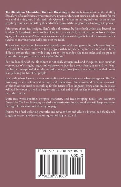 The Bloodborn Chronicles: The Last Reckoning is the sixth installment in the thrilling Bloodborn Chronicles series, where treachery, power, and ancient magic collide in a battle for the very soul of a kingdom. In this epic tale, Queen Elara faces an unimaginable test as an ancient prophecy resurfaces, foretelling the end of her reign and the kingdom she has fought to protect. After years of political intrigue, Elara's rule is threatened by forces both within and beyond her borders. As long-buried secrets of her bloodline are unearthed, she is forced to confront the dark legacy of her ancestors. Allies become enemies, and alliances forged in blood are shattered as the shadow of an even greater evil looms over the realm. The ancient organization known as Vanguard returns with a vengeance, its reach extending into the heart of the royal court. As Elara grapples with betrayal at every turn, she is faced with the difficult choices that come with being a ruler-the sacrifices she must make, and the price of power she must pay to secure her kingdom's future. But the bloodline of the Bloodborn is not easily extinguished, and the queen must summon every ounce of strength, magic, and willpower to face the threats closing in around her. With the help of unexpected allies, she embarks on a perilous journey to confront the dark forces manipulating the fate of her people. In a world where loyalty is a rare commodity, and power comes at a devastating cost, The Last Reckoning is a story of survival, betrayal, and redemption. Elara must decide whether to remain on the throne or sacrifice everything for the future of her kingdom. Every decision she makes will lead her closer to the final battle-one that will either seal her fate or reshape the future of the realm forever. With rich world-building, complex characters, and heart-stopping twists, The Bloodborn Chronicles: The Last Reckoning is a dark and captivating fantasy novel that will keep readers on the edge of their seats until the very last page. Prepare for a final reckoning where the line between hero and villain is blurred, and the fate of a kingdom rests on the choices of one queen willing to risk it all.