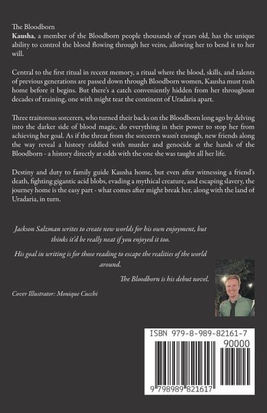 The Bloodborn Kausha, a member of the Bloodborn people thousands of years old, has the ability to control her blood. Central to the first ritual in recent memory, a ritual where the blood, skills, and talents of previous generations are passed down through Bloodborn women, Kausha must rush home before it begins. But there's a catch conveniently hidden from her throughout decades of training. On her journey across Uradaria prior to the ritual, three traitorous sorcerers, who turned their backs on the Bloodborn long ago by delving into the darker side of blood magic, do everything in their power to stop her from achieving her goal. As if the threat from the sorcerers wasn't enough, new friends along the way reveal a history riddled with murder and genocide at the hands of the Bloodborn - a history directly at odds with the one she was taught all her life. Destiny and duty to her family guide Kausha home, but even after witnessing a friend's death, fighting gigantic acid blobs, evading a mythical creature, and escaping slavery, the journey home is the easy part - what comes after might break her, along with the land of Uradaria, in turn. Cover Illustrator: Monique Cucchi