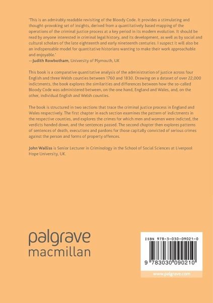 This book is a comparative quantitative analysis of the administration of justice across four English and three Welsh counties between 1760 and 1830. Drawing on a dataset of over 22,000 indictments, the book explores the similarities and differences between how the so-called Bloody Code was administered between, on the one hand, England and Wales, and, on the other, individual English and Welsh counties. The book is structured in two sections that trace the criminal justice process in England and Wales respectively. The first chapter in each section examines the pattern of indictments in the respective counties, and explores the crimes for which men and women were indicted, the verdicts handed down, and the sentences passed. The second chapter then explores patterns of sentences of death, executions and pardons for those capitally convicted of serious crimes against the person and forms of property offences.