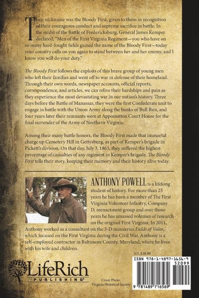 Their nickname was the Bloody First, given to them in recognition of their courageous conduct and supreme sacrifice in battle. In the midst of the Battle of Fredericksburg, General James Kemper declared, Men of the First Virginia Regimentyou who have on so many hard-fought fields gained the name of the Bloody Firsttoday your country calls on you again to stand between her and her enemy, and I know you will do your duty. The Bloody First follows the exploits of this brave group of young men who left their families and went off to war in defense of their homeland. Through their own words, newspaper accounts, official reports, correspondence, and articles, we can relive their hardships and pain as they experience the most devastating war in our nations history. Three days before the Battle of Manassas, they were the first Confederate unit to engage in battle with the Union Army along the banks of Bull Run, and four years later their remnants were at Appomattox Court House for the final surrender of the Army of Northern Virginia. Among their many battle honors, the Bloody First made that immortal charge up Cemetery Hill in Gettysburg, as part of Kempers brigade in Picketts division. On that day, July 3, 1863, they suffered the highest percentage of casualties of any regiment in Kempers brigade. The Bloody First tells their story, keeping their memory and their history alive today.