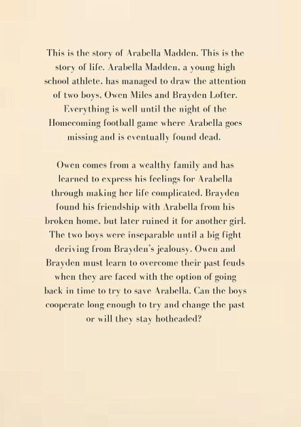 This is the story of Arabella Madden. This is the story of life. Arabella Madden, a young high school athlete, has managed to draw the attention of two boys, Owen Miles and Brayden Lofter. Everything is well until the night of the Homecoming football game where Arabella goes missing and is eventually found dead. Owen comes from a wealthy family and has learned to express his feelings for Arabella through making her life complicated. Brayden found his friendship with Arabella from his broken home, but later ruined it for another girl. The two boys were inseparable until a big fight deriving from Brayden's jealousy. Owen and Brayden must learn to overcome their past feuds when they are faced with the option of going back in time to try to save Arabella. Can the boys cooperate long enough to try and change the past or will they stay hotheaded?