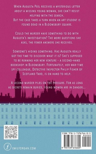 When amateur sleuth Augusta Peel receives a mysterious letter about a missing young woman, she can't resist helping with the search. But the case takes a turn when an art student is found dead in a Bloomsbury square. Could the murder have something to do with Augusta's investigation? The more questions she asks, the fewer answers she receives. Someone's hiding something. Has Augusta really got the time to discover what it is? She's supposed to be running her new venture - a second-hand bookshop in Bloomsbury. Fortunately, her wartime spy colleague, Detective Inspector Philip Fisher of Scotland Yard, is on hand to help. A second murder piles on the pressure. For as long as secrets remain buried, young women are in danger...