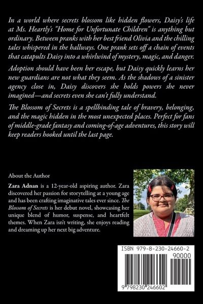 In a world where secrets blossom like hidden flowers, Daisy's life at Ms. Heartly's "Home for Unfortunate Children" is anything but ordinary. Between late-night pranks with her best friend Olivia and the chilling tales whispered in the hallways, Daisy has always clung to the little light she could find. But one prank too many sets off a chain of events that catapults Daisy into a whirlwind of mystery, magic, and danger. Adoption should have been her escape, but Daisy quickly learns her new guardians are not what they seem. As the shadows of a sinister agency close in, Daisy discovers she holds powers she never imagined-and secrets even she can't fully understand. When friendship turns to betrayal and courage is tested, Daisy must uncover the truth about her past before it's too late. Blending humor, suspense, and heartwarming moments, The Bloom of Secrets is a spellbinding tale of bravery, belonging, and the magic hidden in the most unexpected places. Perfect for fans of middle-grade fantasy and coming-of-age adventures, this story will keep readers hooked until the last page.