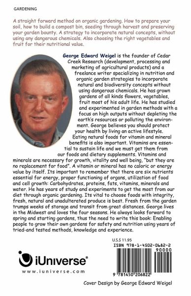A straight forward method on organic gardening. How to prepare your soil, how to build a compost bin, seeding through harvest and preserving your garden bounty. A strategy to incorporate natural concepts, without using any dangerous chemicals. Also choosing the right vegetables and fruit for their nutritional value.