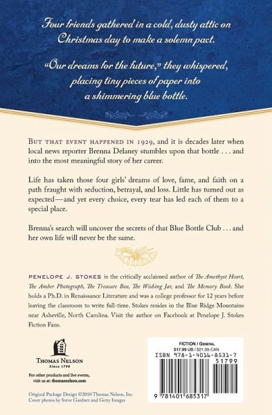 Four friends gathered in a cold, dusty attic on Christmas day to make a solemn pact. "Our dreams for the future," they whispered, placing tiny pieces of paper into a shimmering blue bottle. But that event happened in 1929, and it is decades later when local news reporter Brenna Delaney stumbles upon that bottle . . . and into the most meaningful story of her career. Life has taken those four girls' dreams of love, fame, and faith on a path fraught with seduction, betrayal, and loss. Little has turned out as expected--and yet every choice, every tear has led each of them to a special place. Brenna's search will uncover the secrets of that Blue Bottle Club . . . and her own life will never be the same. "A beautiful novel about friendship and the power of faith to renew our dreams." --Angela Hunt, author of Magdalene