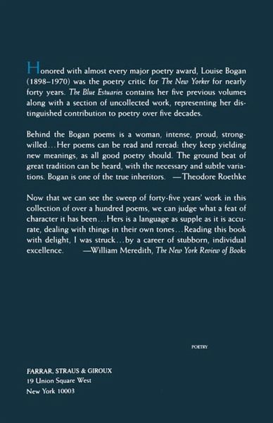 Honored, during the course of her literary career, with almost every major poetry award, Louise Bogan (1898-1970) was the poetry critic for The New Yorker for nearly forty years. The Blue Estuaries contains her five previous books of verse along with a section of uncollected work, fully representing a unique and distinguished contribution to modern poetry over five decades.