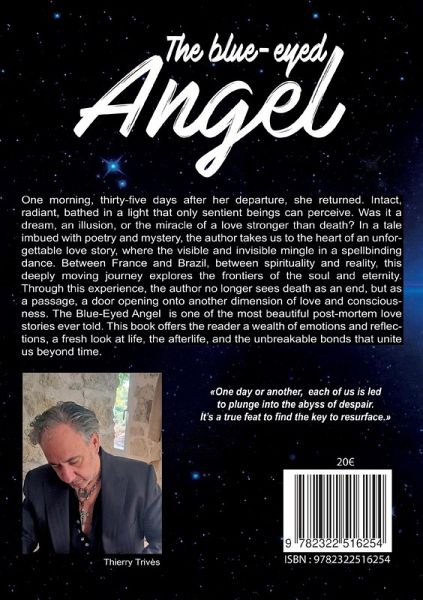 One morning, thirty-five days after her departure, she returned. Intact, radiant, bathed in a light that only sentient beings can perceive. Was it a dream, an illusion, or the miracle of a love stronger than death ? In a tale imbued with poetry and mystery, the author takes us to the heart of an unforgettable love story, where the visible and invisible mingle in a spellbinding dance. Between France and Brazil, between spirituality and reality, this deeply moving journey explores the frontiers of the soul and eternity. Throught this experience, the author no longer sees death as an end, but as a passage, a door opening onto another dimension of love and consciousness. The Blue-Eyed Angel is one of the most beautiful post-mortem love stories ever told. This book offers the reader a wealth of emotions and reflections, a fresh look at life, the afterlife, and the unbreakable bonds that unite us beyond time.