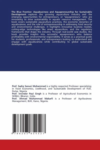 The Blue Frontier: Aquabusiness and Aquapreneurship for Sustainable Development explores the growing aquaculture industry and the emerging opportunities for entrepreneurs, or "aquapreneurs," who are innovating to drive sustainability in aquatic resource management. The book covers sustainable aquaculture practices, the economic dynamics of aquabusiness, and the role of entrepreneurship in addressing food security and environmental challenges. It highlights innovative business models, cutting-edge technologies like smart aquaculture, and the regulatory frameworks that shape the industry. Through real-world case studies, the book provides insights into successful aquapreneurs who balance profitability with environmental responsibility. It serves as a practical guide for students, professionals, and entrepreneurs looking to understand and engage with aquabusiness while contributing to global sustainable development goals.