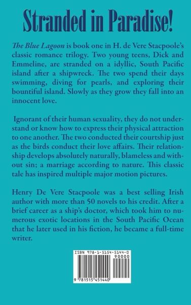 The Blue Lagoon is book one in H. de Vere Stacpoole's classic romance trilogy. Two young teens, Dick and Emmeline, are stranded on a idyllic, South Pacific island after a shipwreck. The two spend their days swimming, diving for pearls, and exploring their bountiful island. Slowly as they grow they fall into an innocent love. Ignorant of their human sexuality, they do not understand or know how to express their physical attraction to one another. The two conducted their courtship just as the birds conduct their love affairs. Their relationship develops absolutely naturally, blameless and without sin; a marriage according to nature. This classic tale has inspired multiple major motion pictures. Henry De Vere Stacpoole was a best selling Irish author with more than 50 novels to his credit. After a brief career as a ship's doctor, which took him to numerous exotic locations in the South Pacific Ocean that he later used in his fiction when he became a full-time writer.