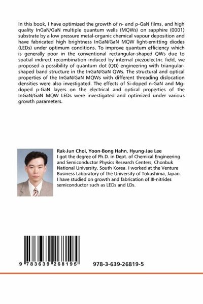 In this book, I have optimized the growth of n- and p-GaN films, and high quality InGaN/GaN multiple quantum wells (MQWs) on sapphire (0001) substrate by a low pressure metal-organic chemical vapour deposition and have fabricated high brightness InGaN/GaN MQW light-emitting diodes (LEDs) under optimum conditions. To improve quantum efficiency which is generally poor in the conventional rectangular-shaped QWs due to spatial indirect recombination induced by internal piezoelectric field, we proposed a possibility of quantum dot (QD) engineering with triangular-shaped band structure in the InGaN/GaN QWs. The structural and optical properties of the InGaN/GaN MQWs with different threading dislocation densities were also investigated. The effects of Si-doped n-GaN and Mg-doped p-GaN layers on the electrical and optical properties of the InGaN/GaN MQW LEDs were investigated and optimized under various growth parameters.