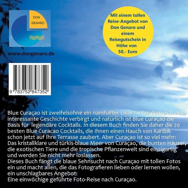 Blue Curacao ist zweifelsohne ein namhafter Likör hinter dem sich eine interessante Geschichte verbirgt und natürlich ist Blue Curacao die Basis für legendäre Cocktails. In diesem Buch finden Sie daher die mit Abstand 20 besten Blue Curacao Cocktails, die Ihnen sofort einen Hauch von Karibik auf Ihre Terrasse zaubert.Aber Blue Curacao ist so viel mehr:Das kristallklare und türkis-blaue Meer von Curacao, die bunten Häuser, die exotischen Tiere und die tropische Pflanzenwelt sind einzigartig und wird Sie nicht mehr loslassen.Dieses Buch fängt die blaue Sehnsucht nach Curacao mit tollen Fotos ein und macht allen, die das Fotografieren lieben oder lernen wollen ein unschlagbares Angebot: Eine einwöchige geführte Fotoreise nach Curacao.Das Buch enthält darüber hinaus einen 50,- Euro Reisegutschein.