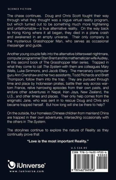 The chase continues. Doug and Chris Scott fought their way through what they thought was a rogue virtual reality program, but which turned out to be something much more frightening and unfathomable-a true alternative reality. On the way back to Hong Kong where it all began, they died in a plane crash and awakened in an empty universe. Their only company is the mysterious Grasshopper Man, who serves as occasional messenger and guide. Another young couple falls into the alternative bittersweet nightmare, computer programmer Stan Brent and his mathematician wife Audrey, in this second book of The Grasshopper Man series. Trapped in what they come to call The System with them are colleagues Mary Wells, Luke Simmons, and Jacob Ellery. The mercenary computer guru Ann Crenshaw and her two assistants, Todd Richards and Brett Thompson, follow them into the trap. They are pursued through time and place by Indonesian pirates, battle their way across wartorn France, relive harrowing episodes from their own pasts, and endure other adventures in Nepal, Irian Jaya, New Zealand, the U.S., and other times and places. Their only help comes from the enigmatic Jane, who was sent in to rescue Doug and Chris and became trapped herself. But how long will she be there to help? On the outside, four homeless Chinese children from mainland China are trapped in their own adventures, intersecting occasionally with the others in The System. The storylines continue to explore the nature of Reality as they continually prove that "Love is the most important Reality."