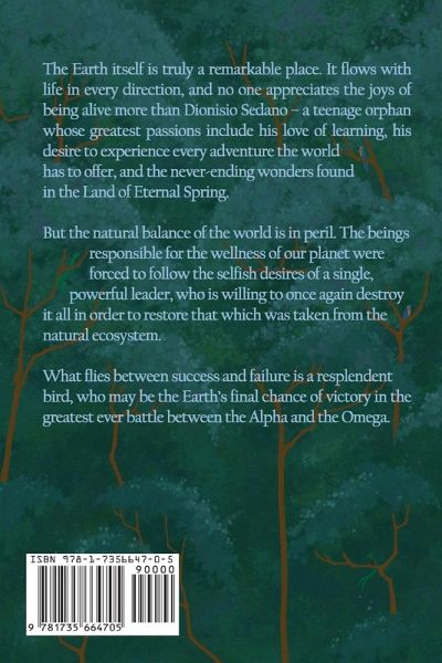 The Earth itself is truly a remarkable place. It flows with life in every direction, and no one appreciates the joys of being alive more than Dionisio Sedano - a teenage orphan whose greatest passions include his love of learning, his desire to experience every adventure the world has to offer, and the never-ending wonders found in the Land of Eternal Spring. But the natural balance of the world is in peril. The beings responsible for the wellness of our planet were forced to follow the selfish desires of a single, powerful leader, who is willing to once again destroy it all in order to restore that which was taken from the natural ecosystem. What flies between success and failure is a resplendent bird, who may be the Earth's final chance of victory in the greatest ever battle between the Alpha and the Omega.