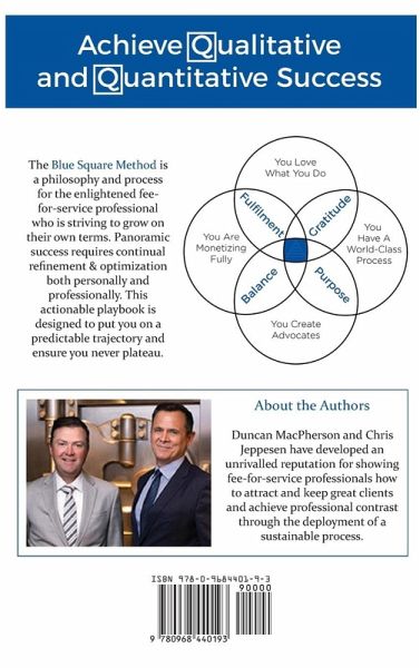 The Blue Square Method The Mindset and Best-Practices of Top Fee-For-Service Professionals The Blue Square Method is a philosophy and process for the enlightened fee-for-service professional who is striving to grow on their own terms. Panoramic success requires continual refinement and optimization both personally and professionally. This actionable playbook is designed to put you on a predictable trajectory and ensure you never plateau. About the Authors: Duncan MacPherson and Chris Jeppesen have developed an unrivalled reputation for showing fee-for-service professionals how to attract and keep great clients and achieve professional contrast through the deployment of a sustainable process.