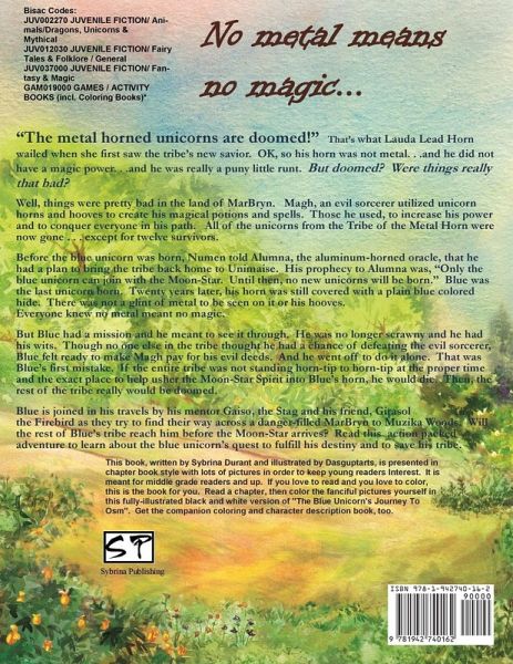 "The metal horned unicorns are doomed!" That's what Lauda Lead Horn wailed when she first saw the tribe's new savior. OK, so his horn was not metal. . .and he did not have a magic power. . .and he was really a puny little runt. But doomed? Were things really that bad? Well, things were pretty bad in the land of MarBryn. Magh, an evil sorcerer utilized unicorn horns and hooves to create his magical potions and spells. Those he used, to increase his power and to conquer everyone in his path. All of the unicorns from the Tribe of the Metal Horn were now gone . . . except for twelve survivors. Before the blue unicorn was born, Numen told Alumna, the aluminum-horned oracle, that he had a plan to bring the tribe back home to Unimaise. His prophecy to Alumna was, "Only the blue unicorn can join with the Moon-Star. Until then, no new unicorns will be born." Blue was the last unicorn born. Twenty years later, his horn was still covered with a plain blue colored hide. There was not a glint of metal to be seen on it or his hooves. Everyone knew no metal meant no magic. But Blue had a mission and he meant to see it through. He was no longer scrawny and he had his wits. Though no one else in the tribe thought he had a chance of defeating the evil sorcerer, Blue felt ready to make Magh pay for his evil deeds. And he went off to do it alone. That was Blue's first mistake. If the entire tribe was not standing horn-tip to horn-tip at the proper time and the exact place to help usher the Moon-Star Spirit into Blue's horn, he would die. Then, the rest of the tribe really would be doomed. Blue is joined in his travels by his mentor Gaiso, the Stag and his friend, Girasol the Firebird as they try to find their way across a danger-filled MarBryn to Muzika Woods. Will the rest of Blue's tribe reach him before the Moon-Star arrives? Read this action packed adventure to learn about the blue unicorn's quest to fulfill his destiny and to save his tribe. This book, written by Sybrina Durant and illustrated by Dasguptarts, is presented in chapter book style with lots of pictures in order to keep young readers Interest. It is meant for middle grade readers and up. If you love to read and you love to color, this is the book for you. Read a chapter, then color the fanciful pictures yourself in this fully-illustrated black and white version of "The Blue Unicorn's Journey To Osm".
