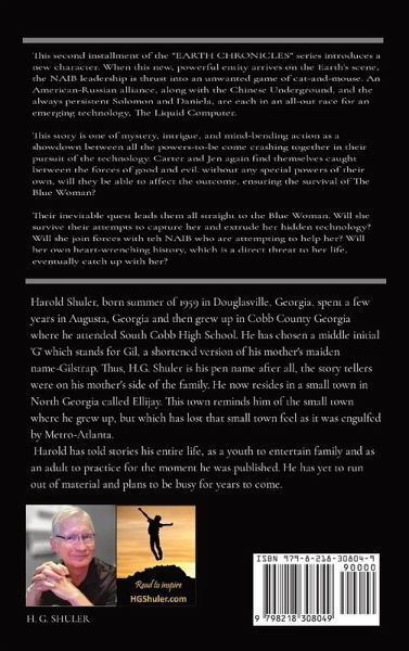 The Blue Woman is the one of three books in a series called EARTH CHRONICLES. It is the third novel by H. G. Shuler to be published. It falls into two categories: Science Fiction Time Travel and Technological Thriller. With traces of a Psychological Thriller appearing throughout, this story will keep you turning pages. One reader described it as, "The best one yet, with The Monsters of Mary Pursey running a close second!" This second installment of the EARTH CHRONICLES series introduces a new character. When this new, powerful entity arrives on the Earth's scene, the NAIB Leadership is thrust into an unwanted game of cat and mouse. An American-Russian alliance, along with the Chinese Underground, and the always persistent Solomon and Daniela, are each in an all-out race for an emerging technology, The Liquid Computer. Their inevitable quest leads them all straight to Nova, the Blue Woman. Will she survive their attempts to capture her and extrude her hidden technology? Will she join forces with the NAIB who are attempting to help her? Will her own heart-wrenching history, which is a direct threat to her life, eventually catch up with her? The story is one of mystery, intrigue, and mind-bending action as a showdown between all the powers-to-be come crashing together in their pursuit of this technology. Carter and Jen again find themselves caught between the forces of good and evil. Without any special powers of their own, will they be able to affect the outcome, ensuring the survival of The Blue Woman?