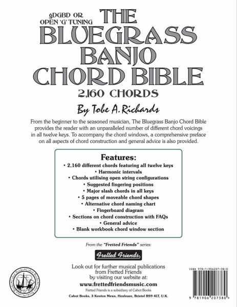 The Bluegrass Banjo Chord Bible, with its 2,160 chords offers a complete solution for both beginner and experienced professional musician alike. The layout is uncomplicated and follows a logical musical progression from standard major chords up to the more esoteric thirteenths used by many jazz players. To accompany the 1,728 chords, a further 720 possible moveable chord configurations are included, together with a useful range of slash chords, reflecting the popularity of this type of chord in many of today's artist and compilation topline songbooks. This highly comprehensive guide provides the musician with no fewer than 68 different types of chord in all twelve keys, making it the definitive publication for the bluegrass banjo. Whether you play folk, rock, pop, jazz or any other type of popular music, The Bluegrass Banjo Chord Bible makes the ideal reference source for all occasions. Standard Chords covered in The Bluegrass Banjo Chord Bible (using the key of C as an example): C, Cm, C7, Cm7, C5, C6, Cm6, Cmaj7, Cdim, Cdim7, C-5, C+, Csus2, Csus4, C7sus4, Cm7-5, Cadd9, Cmadd9, C6add9, Cm6add9, C7-5, C7+5, C7-9, C7+9, Cm(maj7), Cmaj7-5, Cmaj7+5, C9, Cm9, Cmaj9, C11, C13. Advanced Chords covered in The Bluegrass Banjo Chord Bible (using the key of C as an example): C4, Cadd11, Csus4add9, Cm-6, C7sus2, C7-5-9, C7-5+9, C7+5-9, C7+5+9, C7add11, C7add13, C7+11, Cm7-5-9, Cm7-9, Cm7add11, Cmaj7+11, C9sus4, C9-5, C9+5, C9+11, Cm9-5, Cm(maj9), Cmaj9-5, Cmaj9+5, Cmaj9+11, Cmaj9add6, C11-9, Cm11, Cmaj11, C13sus4, C13-5-9, C13-9, C13+9, C13+11, Cm13, Cmaj13. Major Slash Chords covered in The Bluegrass Banjo Chord Bible (using the key of C as an example): C/C, C/Db, C/D, C/Eb, C/E, C/F, C/F#, C/G, C/Ab, C/A, C/Bb, C/B. Beside the many pages of chord boxes or windows, the book features useful sections on tuning, chord construction, fingerboard layout, FAQs, alternative chord naming, fingering, slash chords, harmonic intervals, chord window blanks for transcribing your own favorite chord sequences etc. The aim of this guide is to provide the musician with the flexibility only really offered to guitar and keyboard players in the past. Now, with the help of The The Bluegrass Banjo Chord Bible, musicians will be able to pick up any songbook and instantly have access to even the most complex and advanced chords.