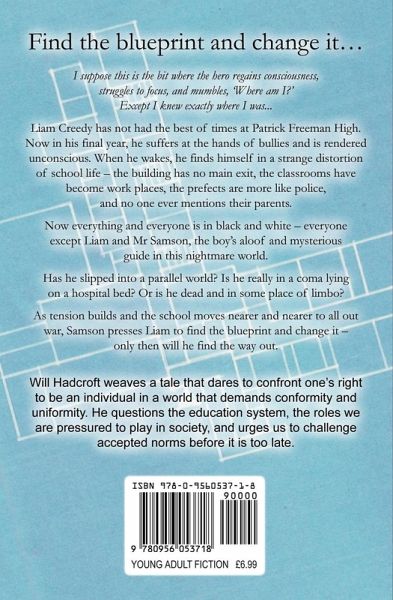Find the blueprint and change it... "I suppose this is the bit where the hero regains consciousness, struggles to focus, and mumbles, 'Where am I?' Except I knew exactly where I was... Liam Creedy has not had the best of times at Patrick Freeman High. Now in his final year, he suffers at the hands of bullies and is rendered unconscious. When he wakes, he finds himself in a strange distortion of school life - the building has no main exit, the classrooms have become work places, the prefects are more like police, and no one ever mentions their parents. Now everything and everyone is in black and white; everyone except Liam and Mr Samson, the boy's aloof and mysterious guide in this nightmare world. Has he slipped into a parallel world? Is he really in a coma lying on a hospital bed? Or is he dead and in some place of limbo? As tension builds and the school moves nearer and nearer to all out war, Samson presses Liam to find the blueprint and change it - only then will he find the way out. Will Hadcroft weaves a tale that dares to confront one's right to be an individual in a world that demands conformity and uniformity. He questions the education system, the roles we are pressured to play in society, and the need to challenge accepted norms before it is too late.
