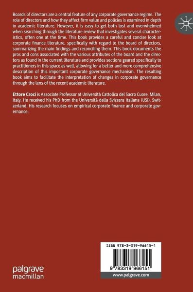 Boards of directors are a central feature of any corporate governance regime. The role of directors and how they affect firm value and policies is examined in depth in academic literature. However, it is easy to get both lost and overwhelmed when searching through the literature review that investigates several characteristics, often one at the time. This book provides a careful and concise look at corporate finance literature, specifically with regard to the board of directors, summarizing the main findings and reconciling them. This book documents the pros and cons associated with the various attributes of the board and the directors as found in the current literature and provides sections geared specifically to practitioners in this space, as well, allowing for a better and more comprehensive description of this important corporate governance mechanism. The resulting book aims to facilitate the interpretation of changes in corporate governance through the lens of the recent academicliterature.