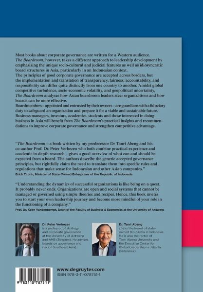 Most books about corporate governance are written for a Western audience. The Boardroom, however, takes a different approach to leadership development by emphasizing the unique socio-cultural and judicial features as well as idiosyncratic board structures in Asia, particularly in an Indonesian context.