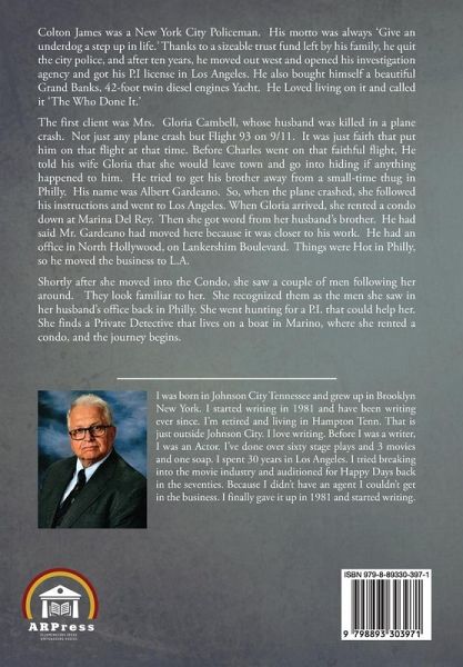Colton James was a New York City Policeman. His motto was always "Give an underdog a step up in life." Thanks to a sizeable trust fund left by his family, he quit the city police, and after ten years, he moved out west and opened his investigation agency and got his P.I license in Los Angeles. He also bought himself a beautiful Grand Banks, 42-foot twin diesel engines Yacht. He Loved living on it and called it "The Who Done It."The first client was Mrs. Gloria Cambell, whose husband was killed in a plane crash. Not just any plane crash but Flight 93 on 9/11. It was just faith that put him on that flight at that time. Before Charles went on that faithful flight, He told his wife Gloria that she would leave town and go into hiding if anything happened to him. He tried to get his brother away from a small-time thug in Philly. His name was Albert Gardeano. So, when the plane crashed, she followed his instructions and went to Los Angeles. When Gloria arrived, she rented a condo down at Marina Del Rey. Then she got word from her husband's brother. He had said Mr. Gardeano had moved here because it was closer to his work. He had an office in North Hollywood, on Lankershim Boulevard. Things were Hot in Philly, so he moved the business to L.A.Shortly after she moved into the Condo, she saw a couple of men following her around. They look familiar to her. She recognized them as the men she saw in her husband's office back in Philly. She went hunting for a P.I. that could help her. She finds a Private Detective that lives on a boat in Marino, where she rented a condo, and the journey begins.