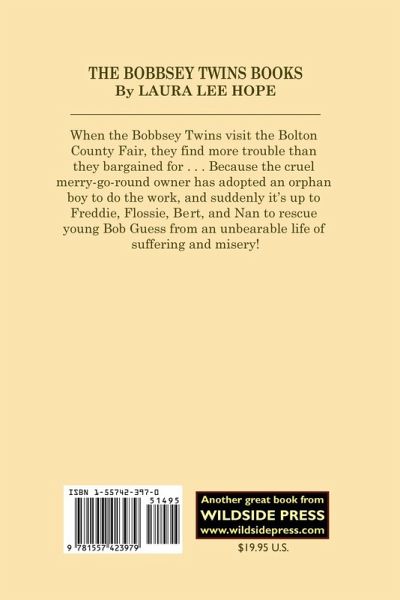 When the Bobbsey Twins visit the Bolton County Fair, they find more trouble than they bargained for...because the cruel merry-go-round owner has adopted an orphan boy to do the work, and suddenly it's up to Freddie, Flossie, Bert, and Nan to rescue young Bob Guess from an unbearable life of suffering and misery!