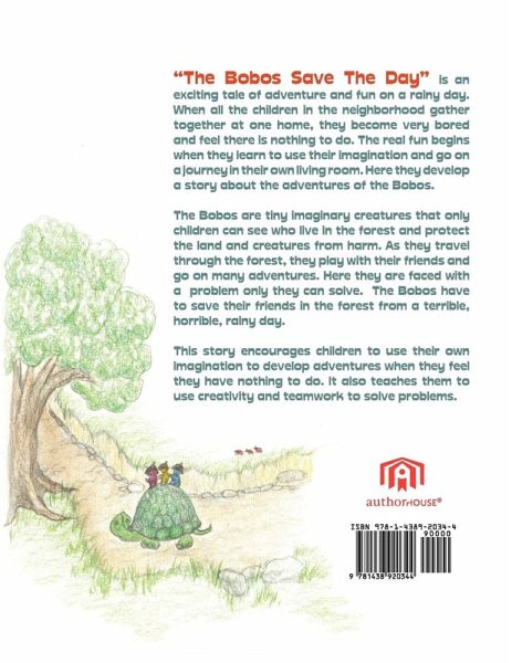 "The Bobos Save The Day" is an exciting tale of adventure and fun on a rainy day. When all the children in the neighborhood gather together at one home, they become very bored and feel there is nothing to do. The real fun begins when one one Mom teaches them to use their imagination and go on a journey in their own living room. Here they develop a story about the adventures of the Bobos. The Bobos are tiny imaginary creatures that only children can see who live in the forest and protect the land and creatures from harm. As they travel through the forest, they play with their friends and go on many adventures until they are faced with a problem only they can solve. The Bobos then have to save their friends in the forest from the terrible, horrible rainy day. This story encourages children to use their own imagination to develop adventures when they feel they have nothing to do. It also teaches them to use creativity and teamwork to solve problems.